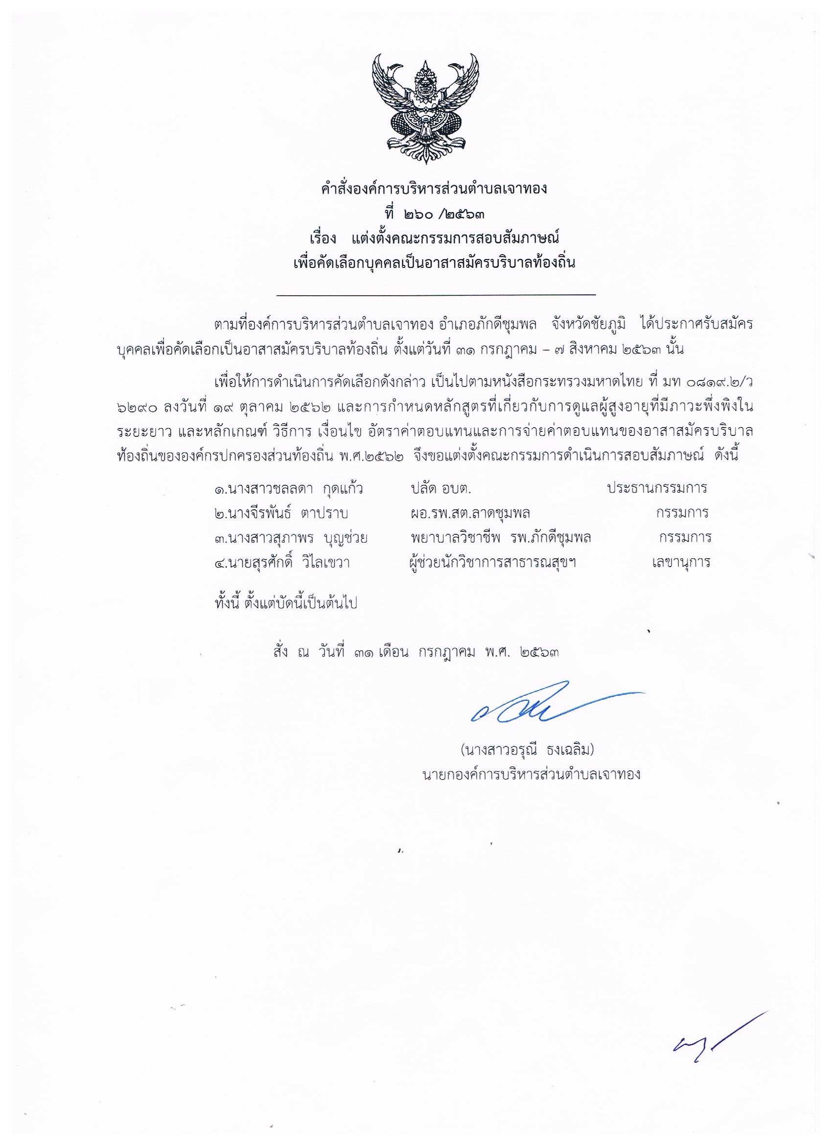คำสั่งองค์การบริหารส่วนตำบลเจาทอง ที่ 260/2563