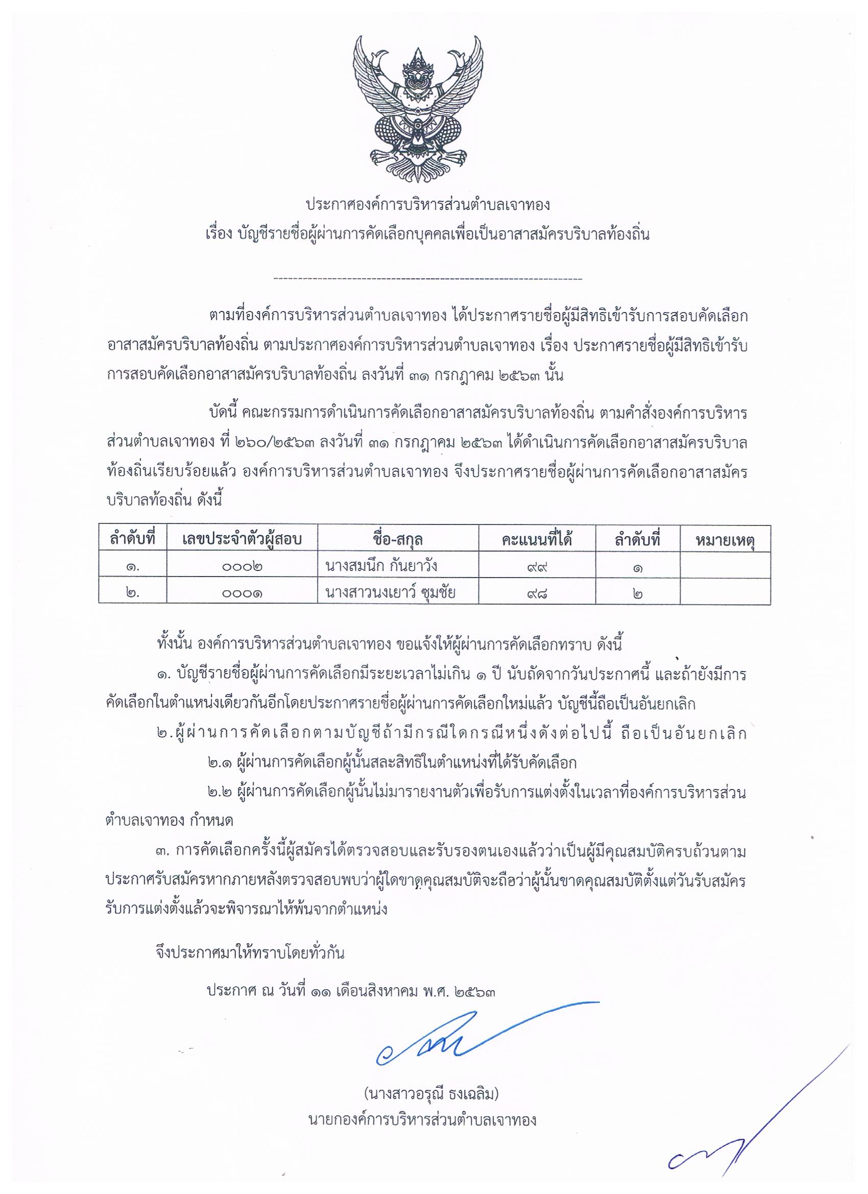 เรื่อง บัญชีรายชื่อผู้ผ่านคัดเลือกบุคคลเพื่อเป็นอาสาสมัครบริบาลท้องถิ่น